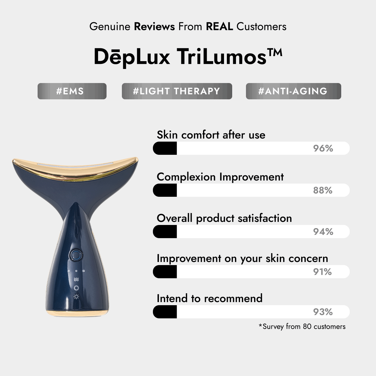 Did you know? The neck is usually the first area to give away your age. Get a youthful neck and body with the help of the DēpLux TriLumos™ Neck Lifting Device. TriLumos™ empowers the powerful benefits of Red, Blue & Purple Light to help you easily achieve firmer, tighter, and smoother skin. Get rid of turkey neck and sagging décolletage today.