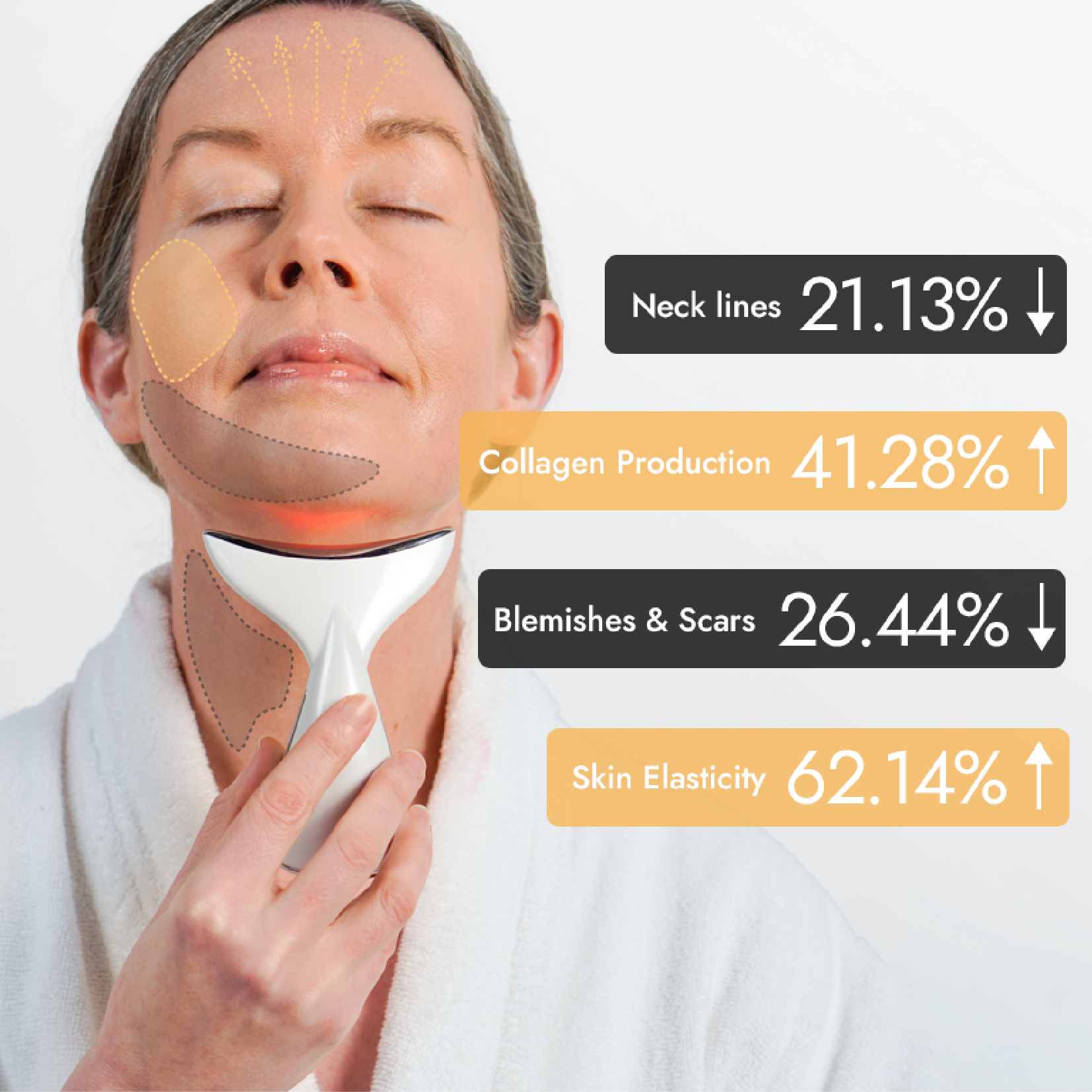 Device help to visibly lift, firm and tighten your neck, décolletage and body by using red light therapy to stimulate beneficial processes at the cellular level.